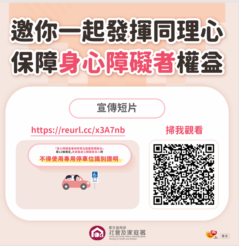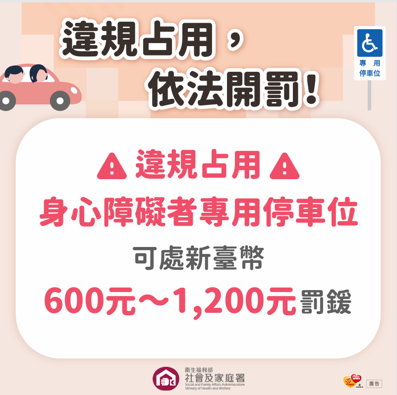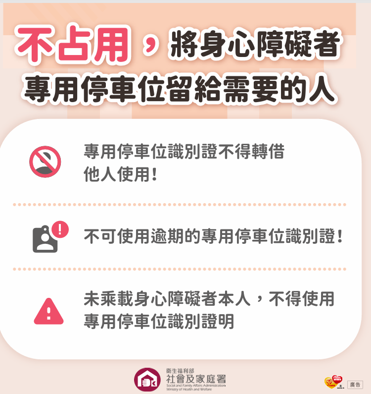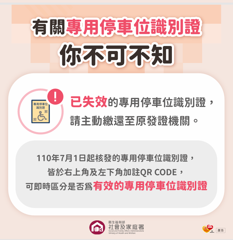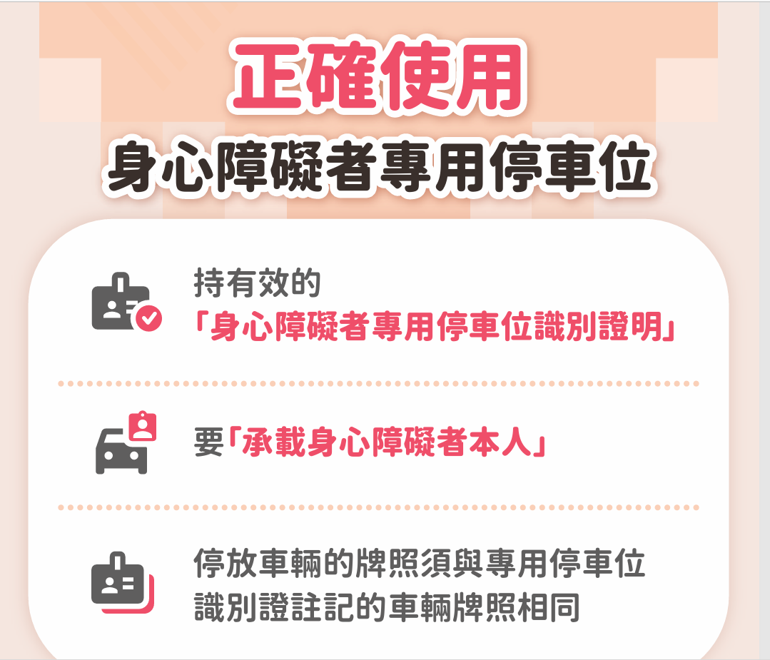 衛生福利部社會及家庭署時常接獲民眾陳情專用停車位遭占用情事,為使民眾瞭解使用專用停車位時機以及違規占用罰鍰,爰製作宣導圖卡,並公布於衛生福利部社會及家庭署身心障礙服務入口網(網址:https://dpws.sfaa.gov.tw)/主題專區/專用停車位識別證/宣導專區,請請轉知,以建立國人正確使用專用停車位之觀念。 |