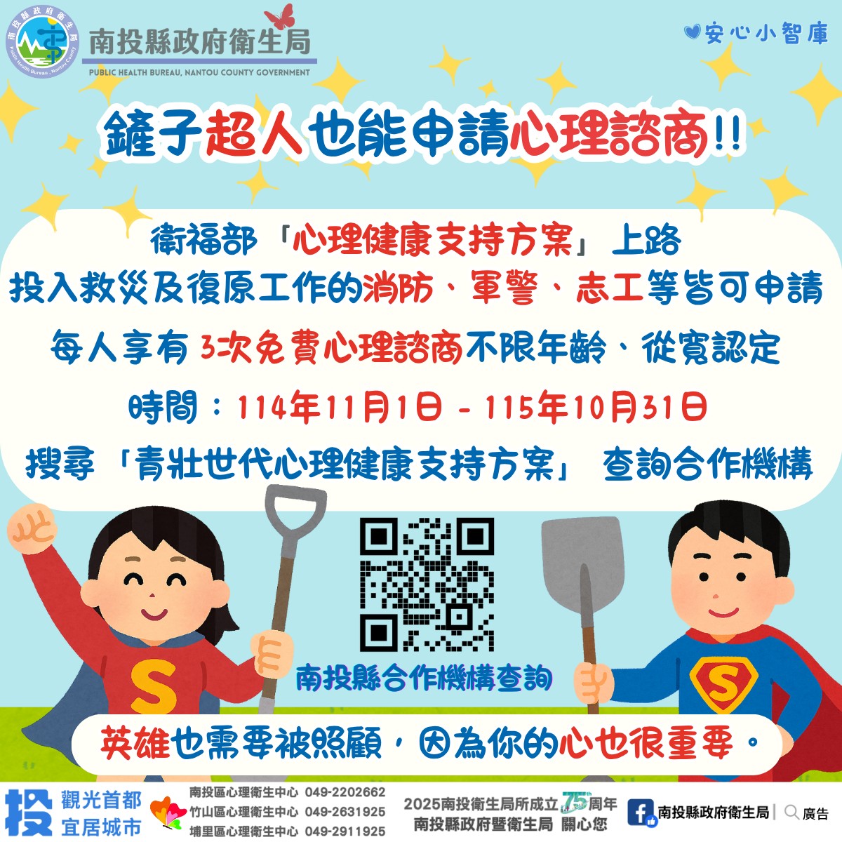 為因應114年9月23日花蓮縣馬太鞍溪堰塞湖溢流災害,提供救災人員及志工心理支持與專業協助,有需求者請洽南投縣各衛生所或心衛中心。 |