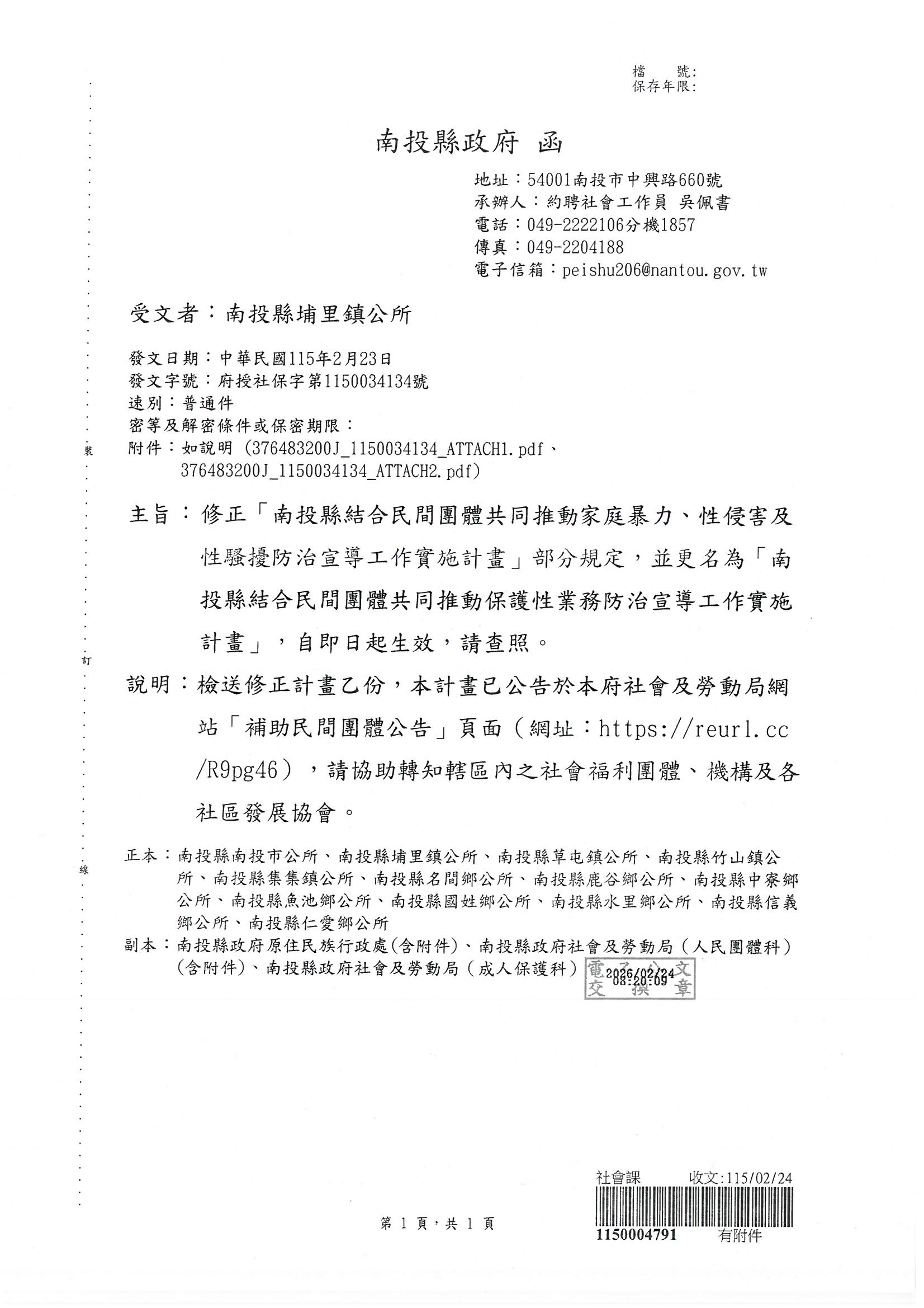 修正「南投縣結合民間團體共同推動家庭暴力、性侵害及 性騷擾防治宣導工作實施計畫」部分規定,並更名為「南 投縣結合民間團體共同推動保護性業務防治宣導工作實施 計畫」